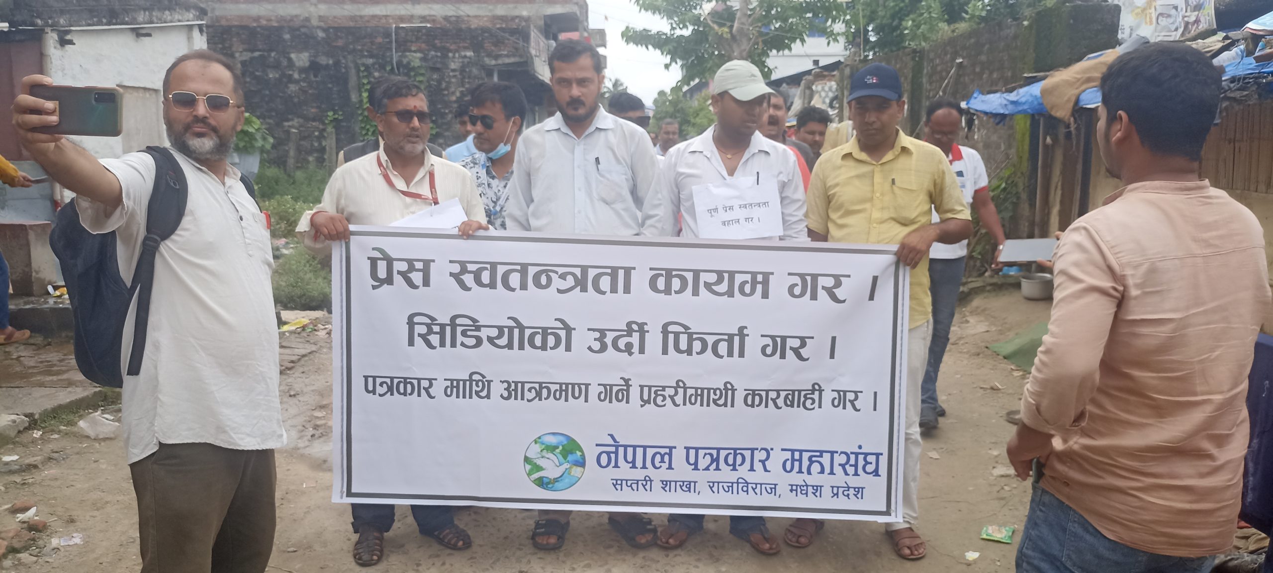 आन्दोलित पत्रकारहरू बिरोध प्रदर्शन गर्दै नगर परिक्रमा गरि जिल्ला प्रशासन कार्यालय सप्तरीको मुख्य गेटमा पत्रकाहरु बिहीबार धर्नामा बसेका हुन् ।