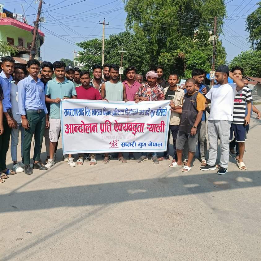 राजबिराज । रामराजा प्रसाद सिंह स्वास्थ्य विज्ञान प्रतिष्ठानको कामकाज संचालन गर्न माग गर्दै सप्तरी युथले राजबिराजमा प्रदर्शन गरिएको छ ।