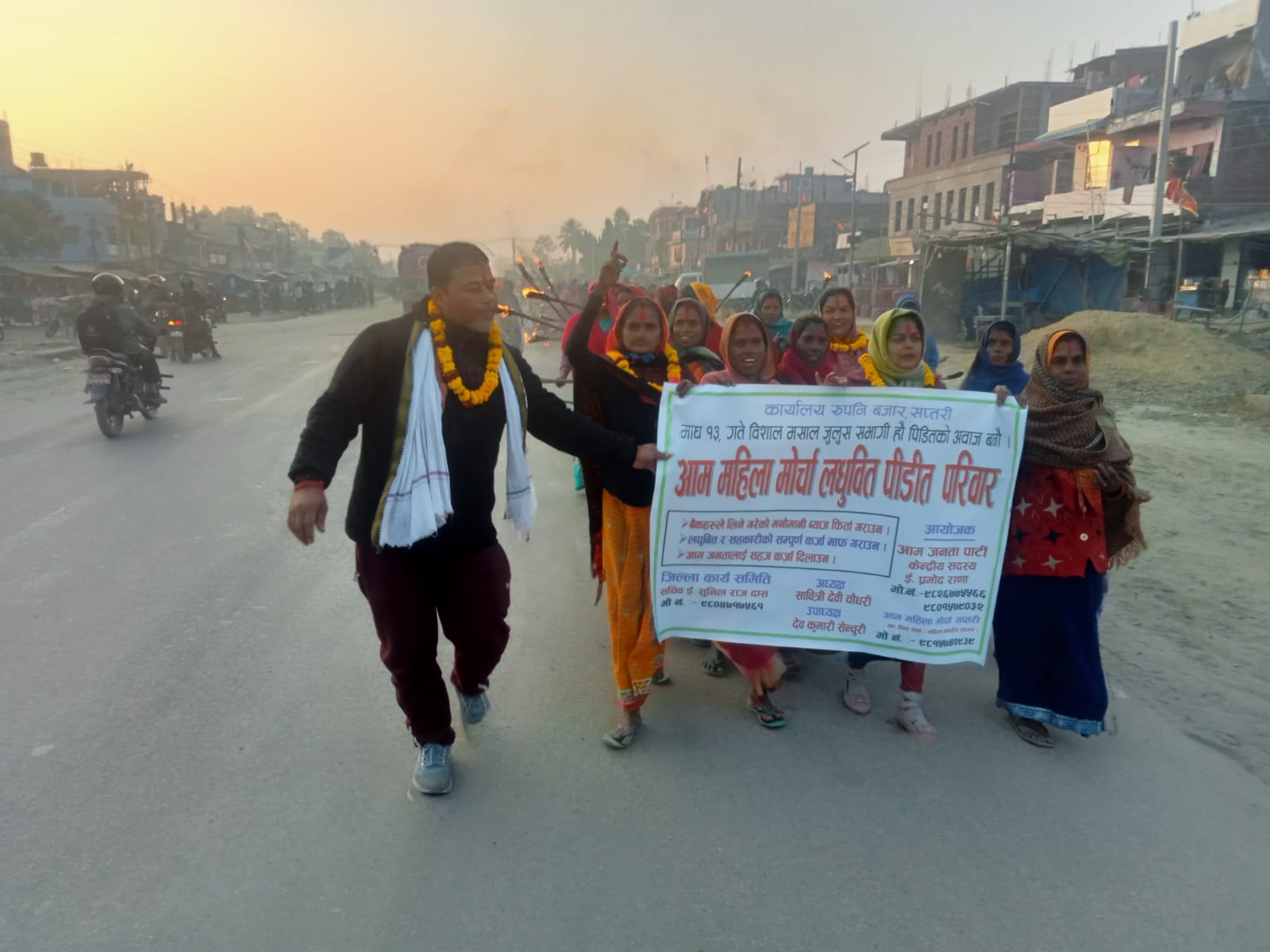 आम महिला मोर्चा लघुवित्त पीडित परिवार सप्तरीका अध्यक्ष सावित्री चौधरीको नेतृत्वमा विभिन्न नारावाजी गर्दै मसाल जुलुस सहित पीडितहरुले रुपनी बजार परिक्रमा गरेका थिए ।