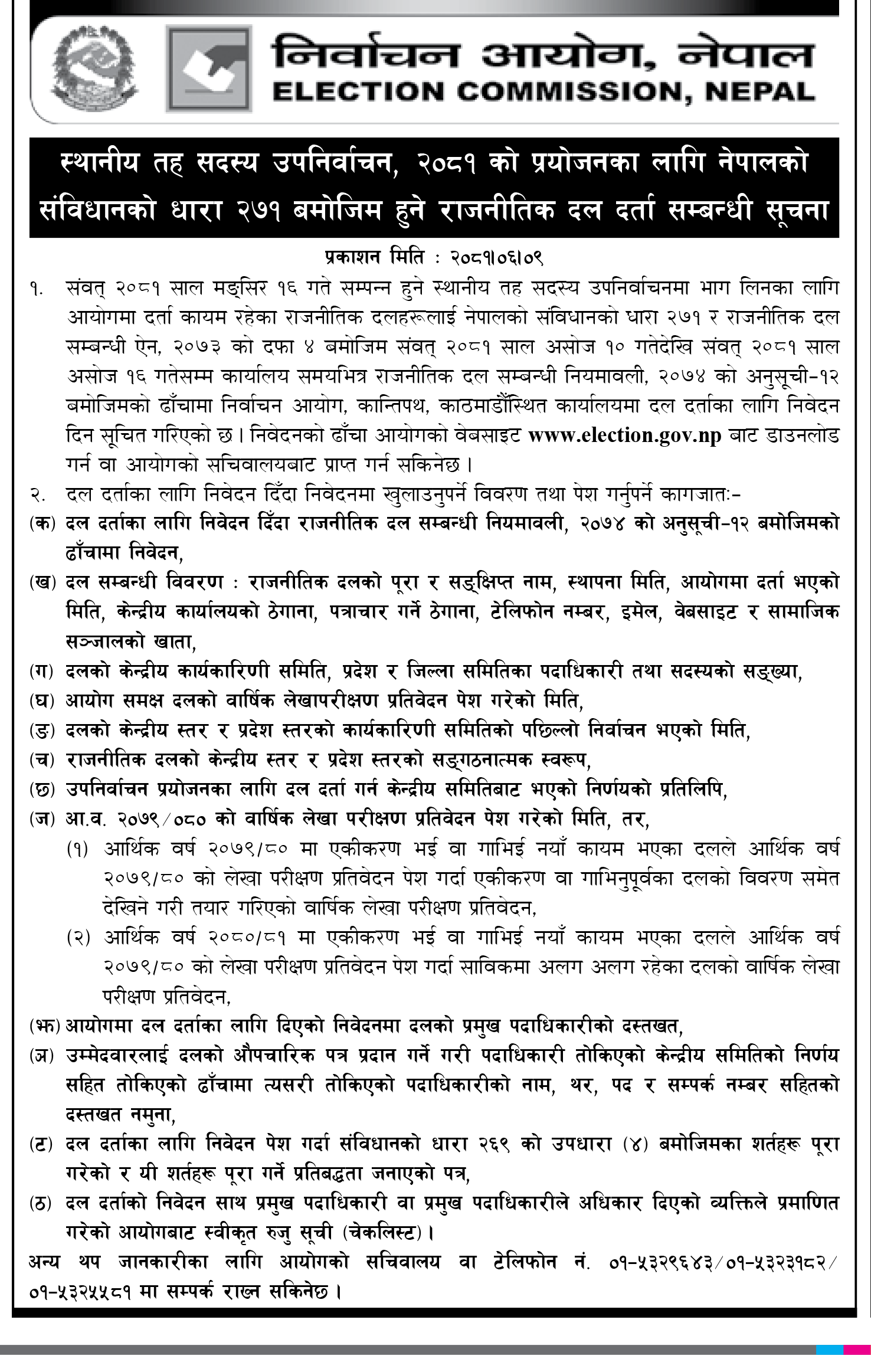 काठमाडौँ – मंसिर १६ गते हुने स्थानीय तह उपनिर्वाचनका लागि आजदेखि दल दर्ता शुरू भएको छ ।