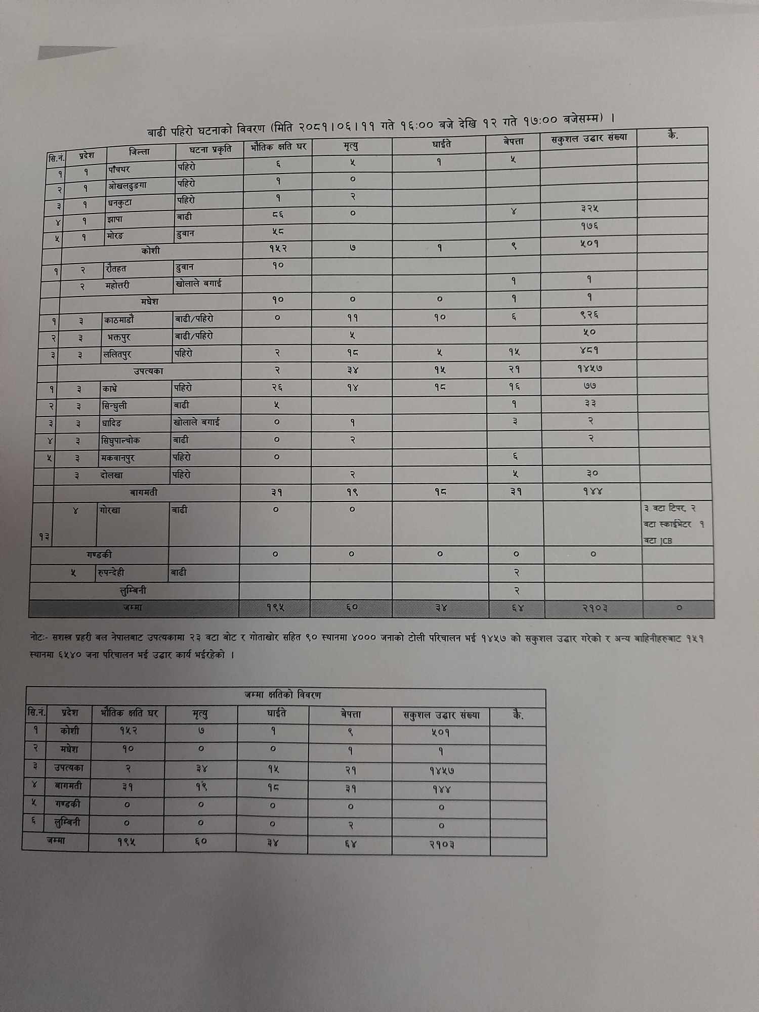 सबैभन्दा धेरै बागमती प्रदेशमा क्षति भएको छ । काठमाडौं उपत्यकामा मात्र ३४ जनाको मृत्यु भएको छ भने २१ जना बेपत्ता छन् । यस्तै बागमती प्रदेशका अन्य जिल्लाहरूमा १९ जनाको मृत्यु भएको छ भने ३१ जना बेपत्ता छन् ।