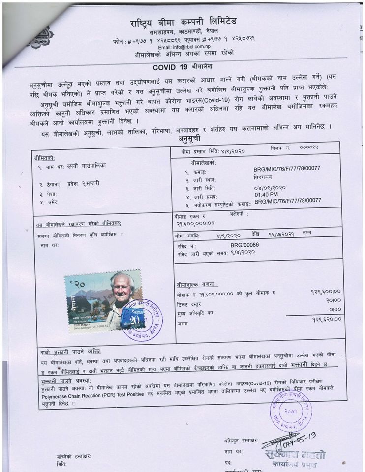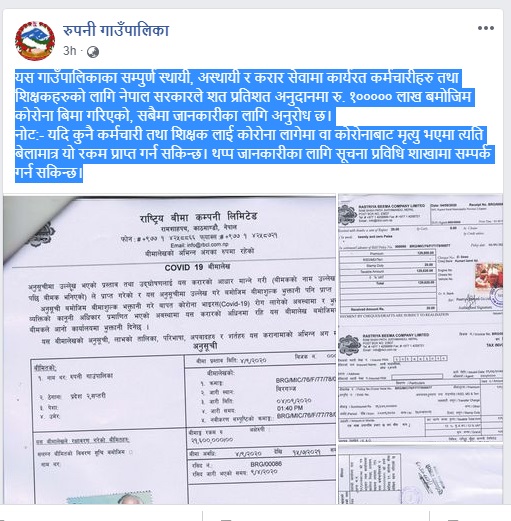 कुनै कर्मचारी लाई कोरोन लग्न गएमा वा कोरोन बाट मृत्यु हुन गएमा उक्त बेला मात्र बिमा को रकम माग गर्न सकिने बारे रुपनी गाउँपालिकाले आफ्नो फेसबुक पेज बाट सार्वजनिक गरेका छन् ।