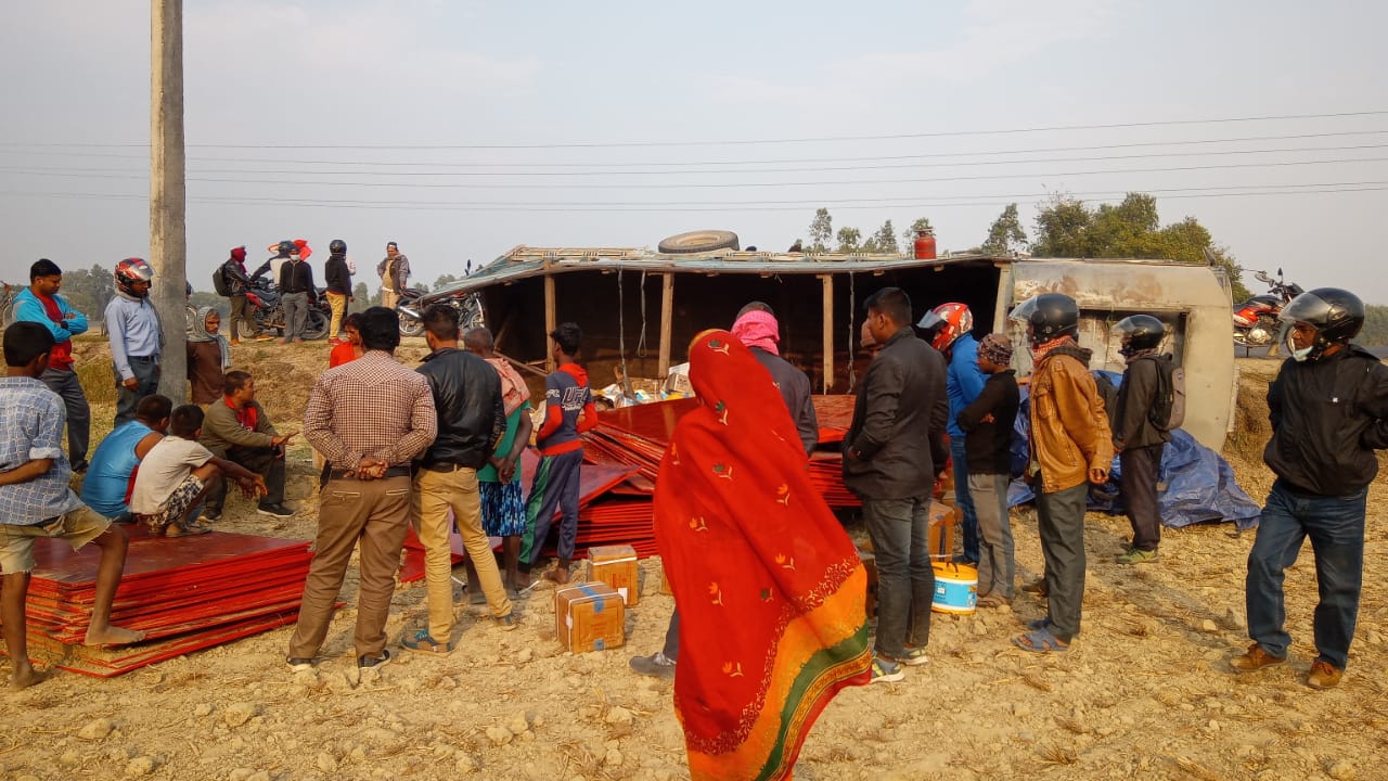 ट्रकमा पलाई ,पेन्ट जस्ता सामग्री रहेको थियो । उत्तर बाट दक्षिण जादै गरेको ना २ ख ९३४१ नम्बरको ट्रक टायर पड्केर अनियन्त्रित भइ सडक बाट तल गँहु खेतमा झरेको हो ।
