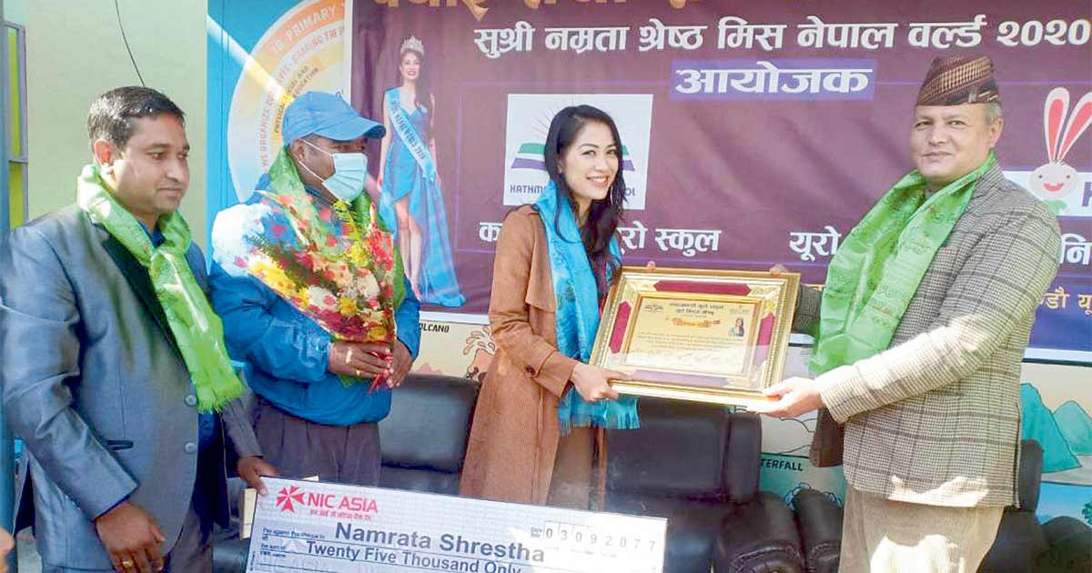 सप्तरी – काठमाडौं युरो स्कुलको प्रिस्कुल युरो किड्स गोंगबुले मिस नेपाल नम्रता श्रेष्ठलाई नगदसहित सम्मान गरेको छ। नम्रता युरो किड्सकी शिक्षिका हुन्।