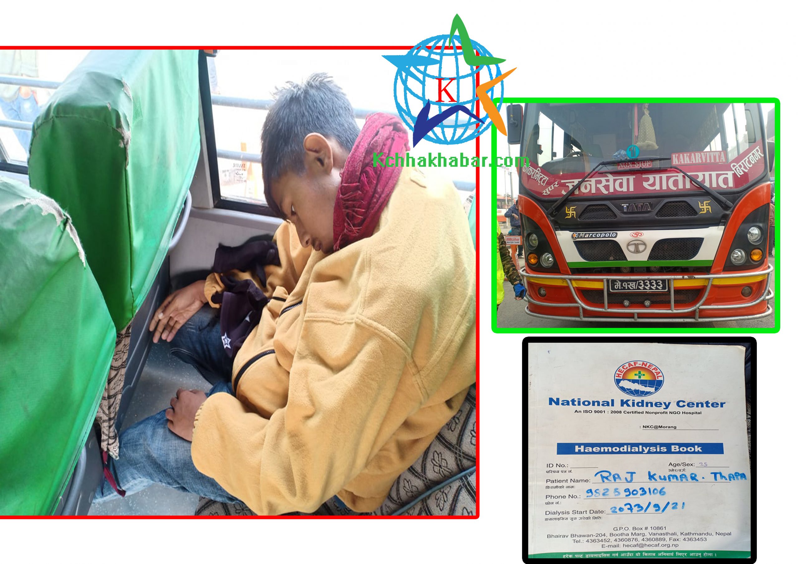 झापाको केर्खाबाट विराटनगर आएका सो युवाको गाडीमै मृत्यु भएको प्रहरीले जनाएको छ । प्रहरीका अनुसार झापाको केर्खा घर भएका २६ वर्षीय युवक राजकुमार थापा किडनी को बिरामी रहेको थियो । बिहान केर्साबाट मे १ ख ३३३३ नम्बरको जनसेवा यातायात प्रा.लि.को बसमा चढेर आएका उनी विराटनगर बसपार्कमा झर्ने बेलामा मृत अवस्था फेला परेको प्रहरीले जानकारी दिए ।