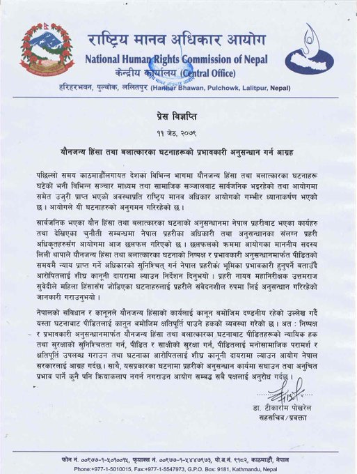 यौन हिंसा र बलात्कारका घटनाको निष्पक्ष र प्रभावकारी अनुसन्धान गर्नू : आयोग