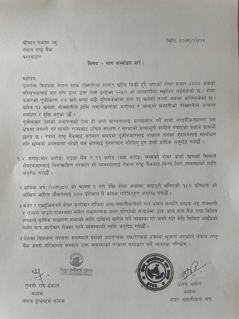 राष्ट्र बैंकका गभर्नरलाई शेयर लगानीकर्ताले बुझाए ४ बुँदे माग